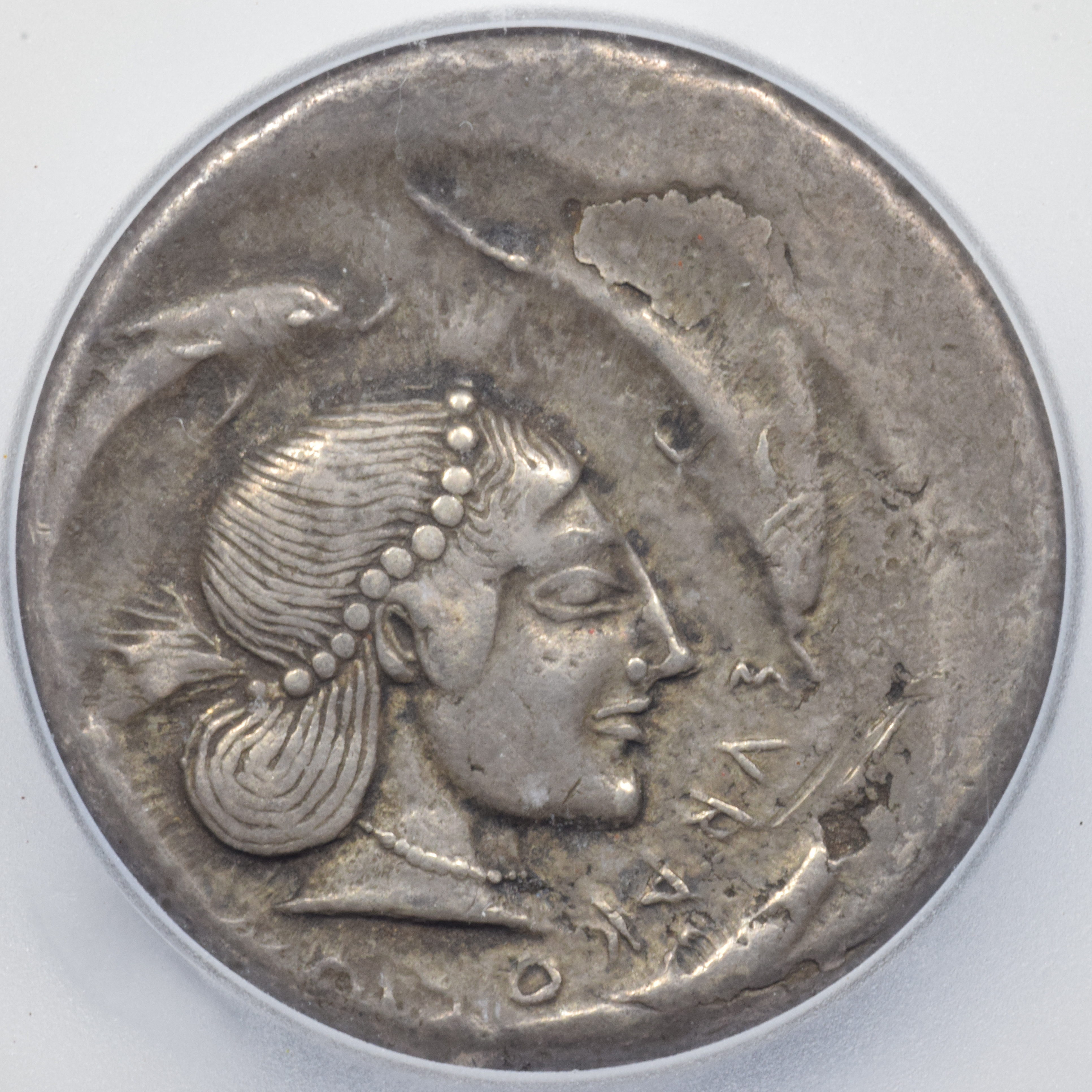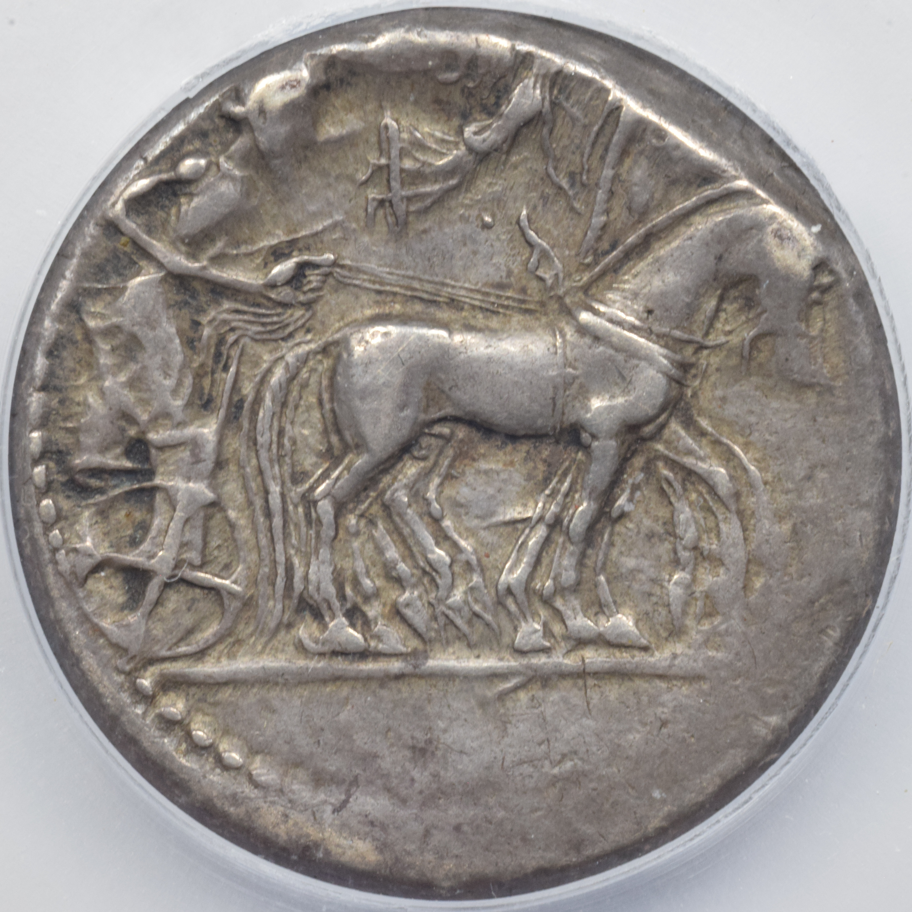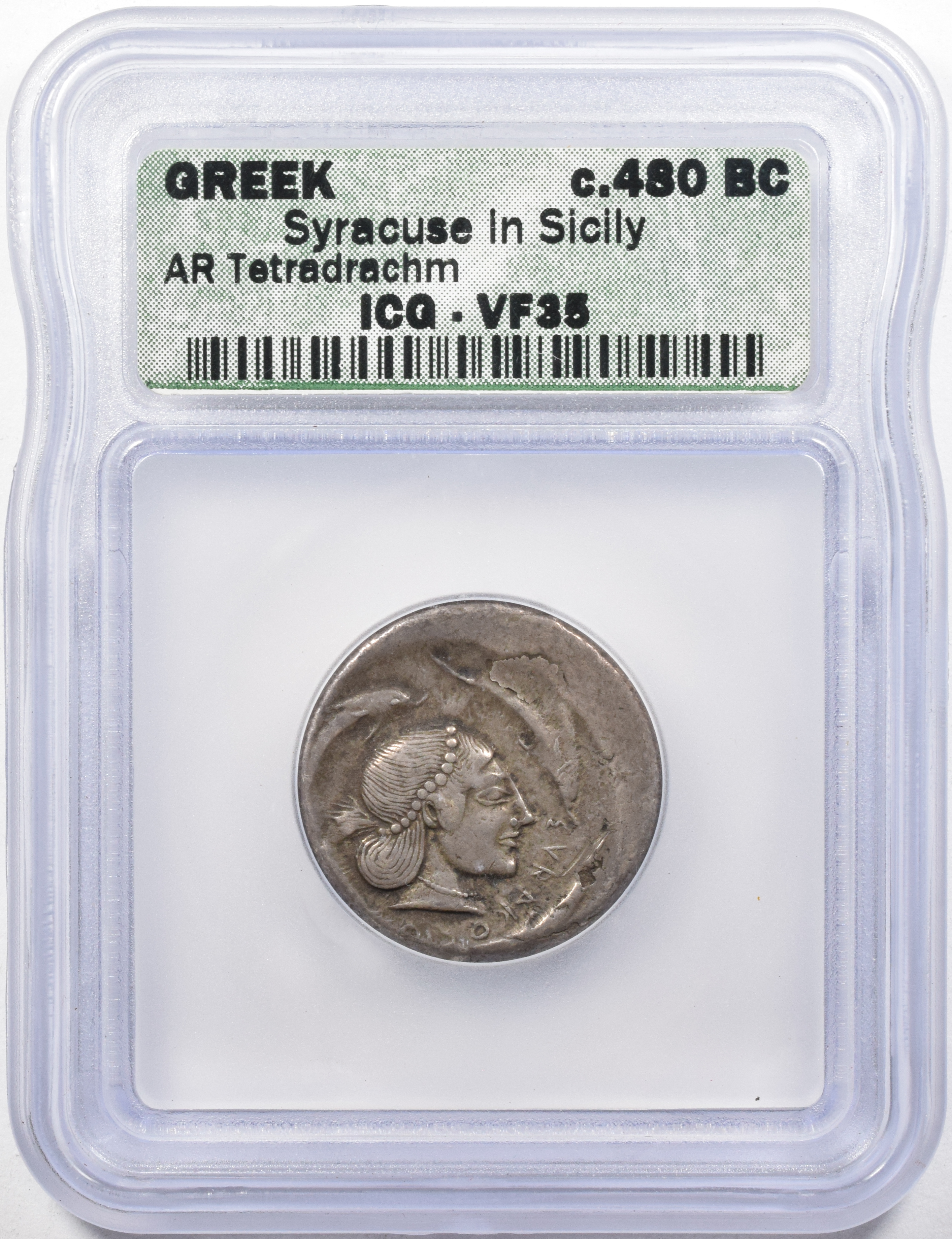 | CFC | 1 H S | circa 480 B.C. | ANCIENT GREECE | AR Tetradrachm | Syracuse in Sicily | ICG Certificate 2820900104 | Silver | Choice Very Fine | $1,850.00 | ||||||