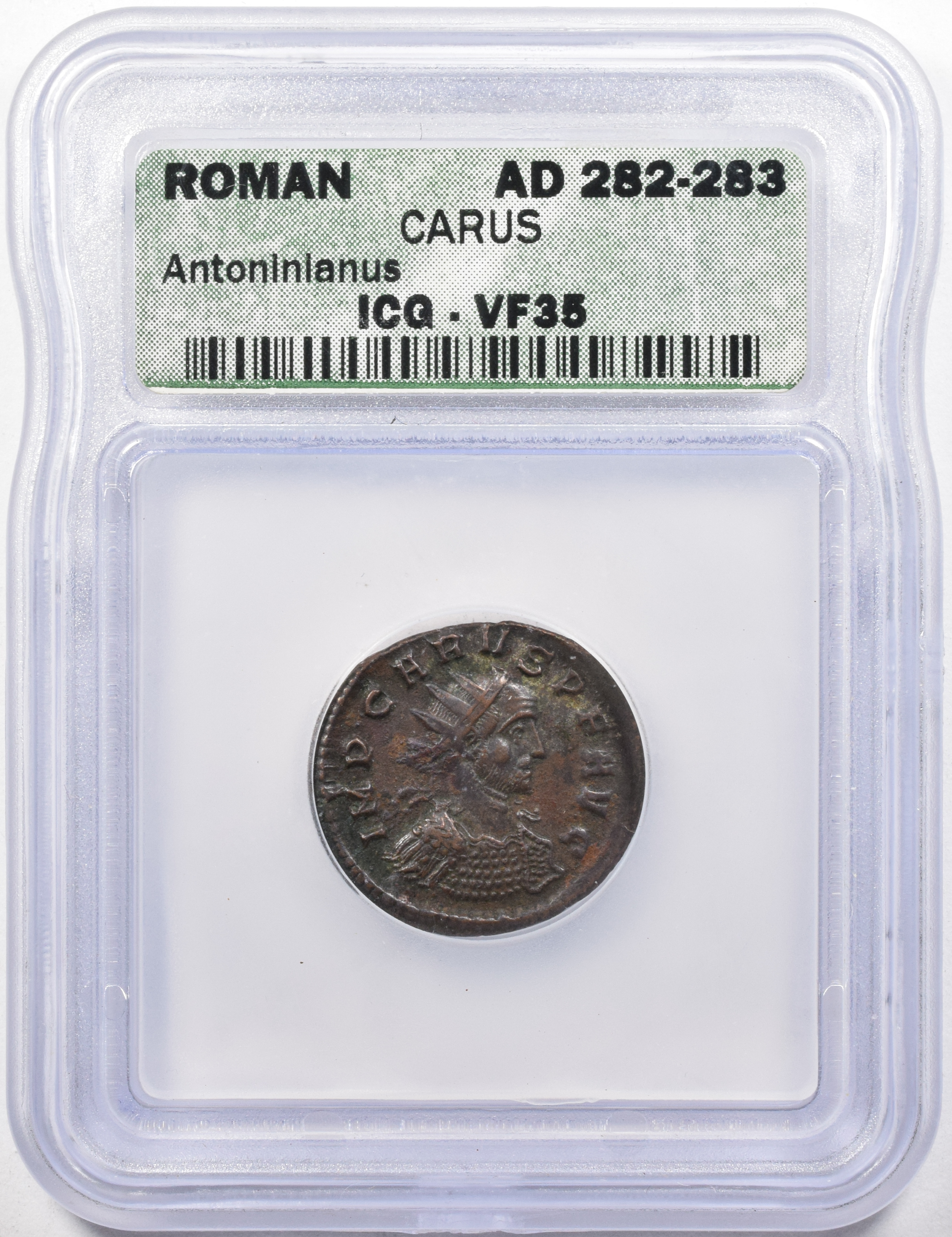 | CFC | 16 H S | AD 282-283 | IMPERIAL ROME | AE Antoninianus | Carus | ICG Certificate 1699620116 | Bronze | Choice Very Fine | $450.00 | |||