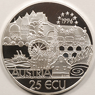 | FC | 31618 | 1996 | AUSTRIA | 25 Ecu | Wolfgang Mozart Scene | Symbol of Austria | 0.925 | Silver | Proof | $55.00 | ||||