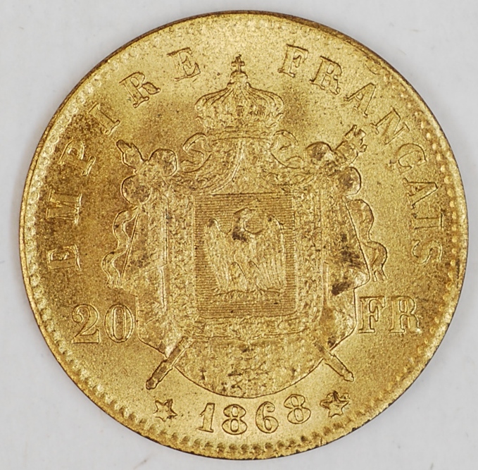 | FC | 16548 | 1868* COPIA | FRANCE | 20 Francs | Napoleon III | 2.8 Gm. 9k COPY | Gold 9 K | About Uncirculated | $80.00 | ||||||