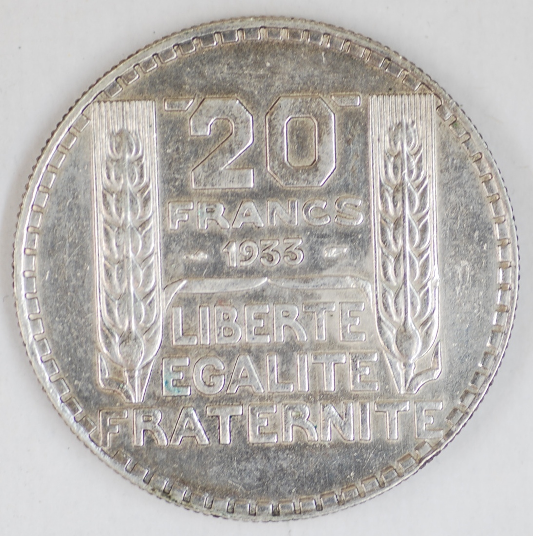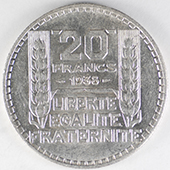 FC | 39133 | 1938 | FRANCE | 20 Francs | Laureate Head Right | Value above Date | 0.680 | 0.4372 | Silver | 879 | Extremely Fine | $20.00 | |