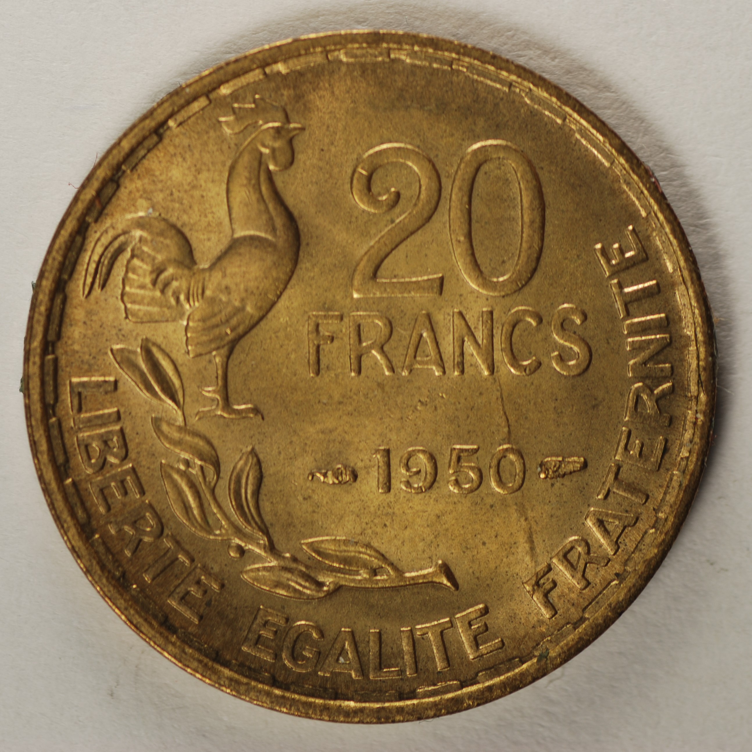 | FC | 25181 | 1950 | FRANCE | 20 Francs | Head Left | Rooster | Aluminum-Bronze | 916.1 | Bril. Uncirculated | $12.00 | |||||