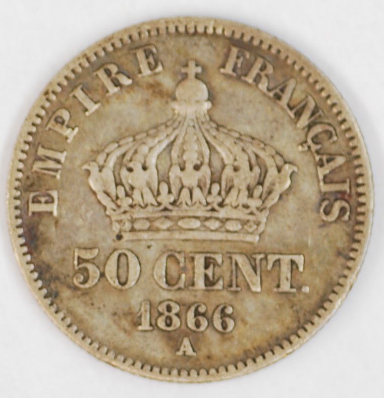 | FC | 37449 | 1866-A | FRANCE | 50 Centimes | Napoleon III | Crown above denomination | 0.835 | 0.0671 | Silver | 814.1 | Very Fine | $12.00 | ||