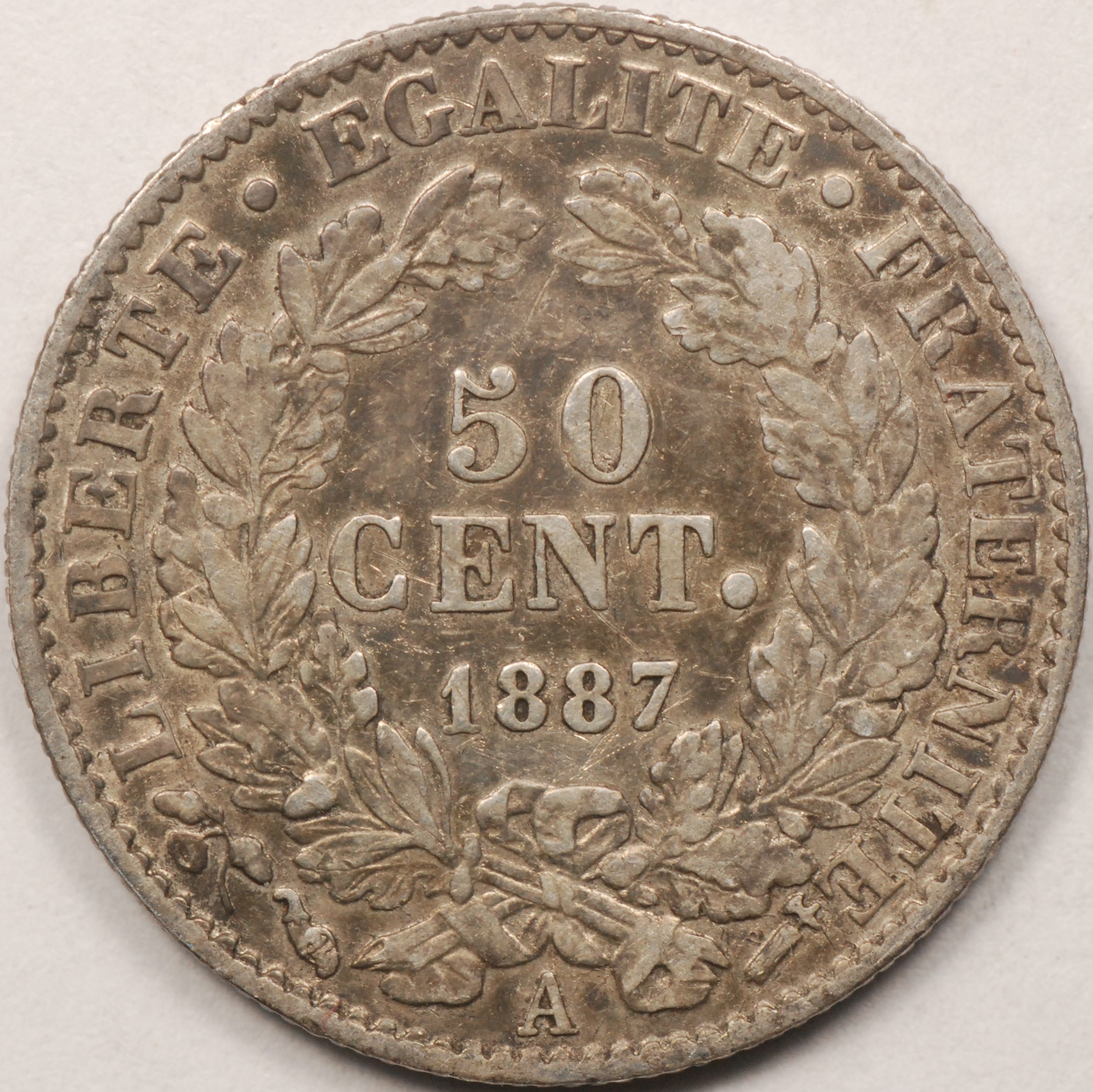 | FC | 29213 | 1887-A | FRANCE | 50 Centimes | Laureate Head Left | Value within Wreath | 0.835 | 0.0671 | Silver | 834.1 | Extremely Fine | $25.00 | ||
