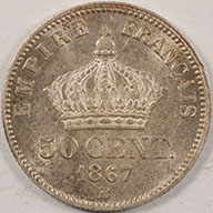 | FC | 37451 | 1867-K | FRANCE | 50 Centimes | Napoleon III | Crown above denomination | 0.835 | 0.0671 | Silver | 814.3 | Very Fine | $12.00 | ||