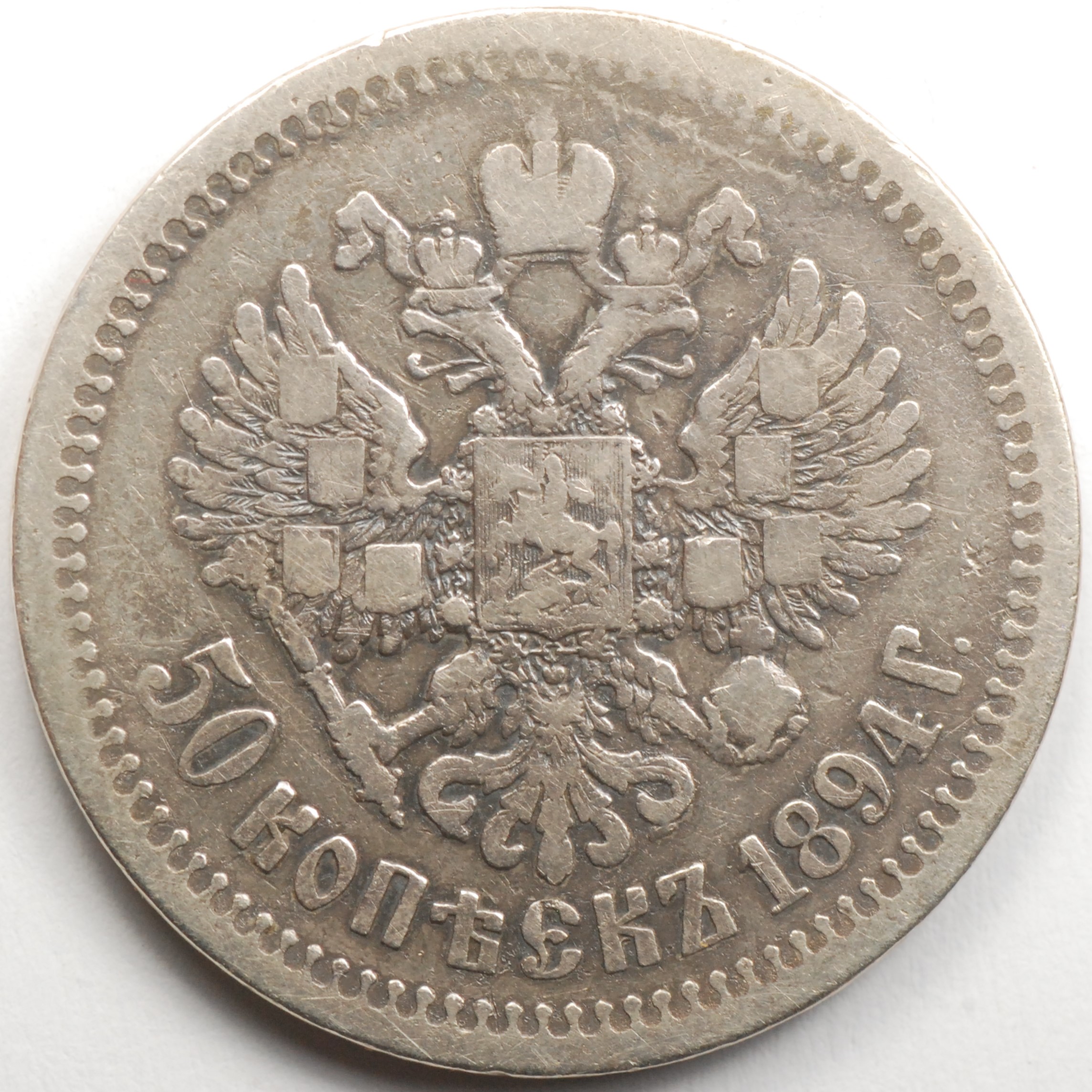 | FC | 4705 | 1894 | RUSSIA | 50 Kopeks | Crowned Double-headed Eagle | Alexander III | 0.900 | 0.2983 | Silver | #Y #45 | Very Fine | $65.00 | |||