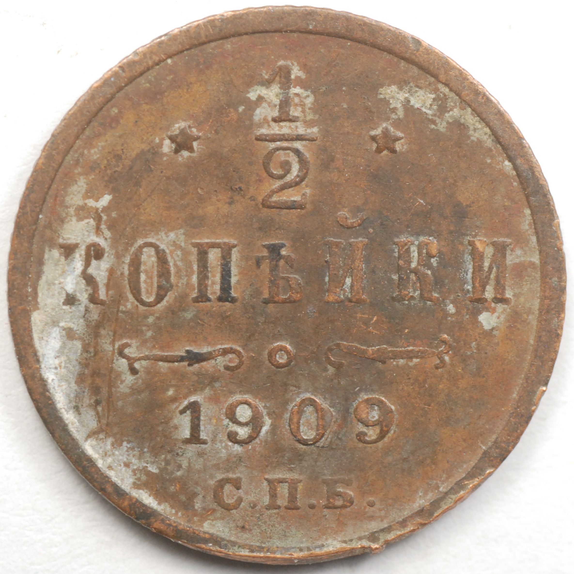 | FC | 31313 | 1909-CПБ | RUSSIA | 1/2 Kopek | Crowned Monogram | Nicholas II | Copper | 48.1 | Extremely Fine | $20.00 | |||||