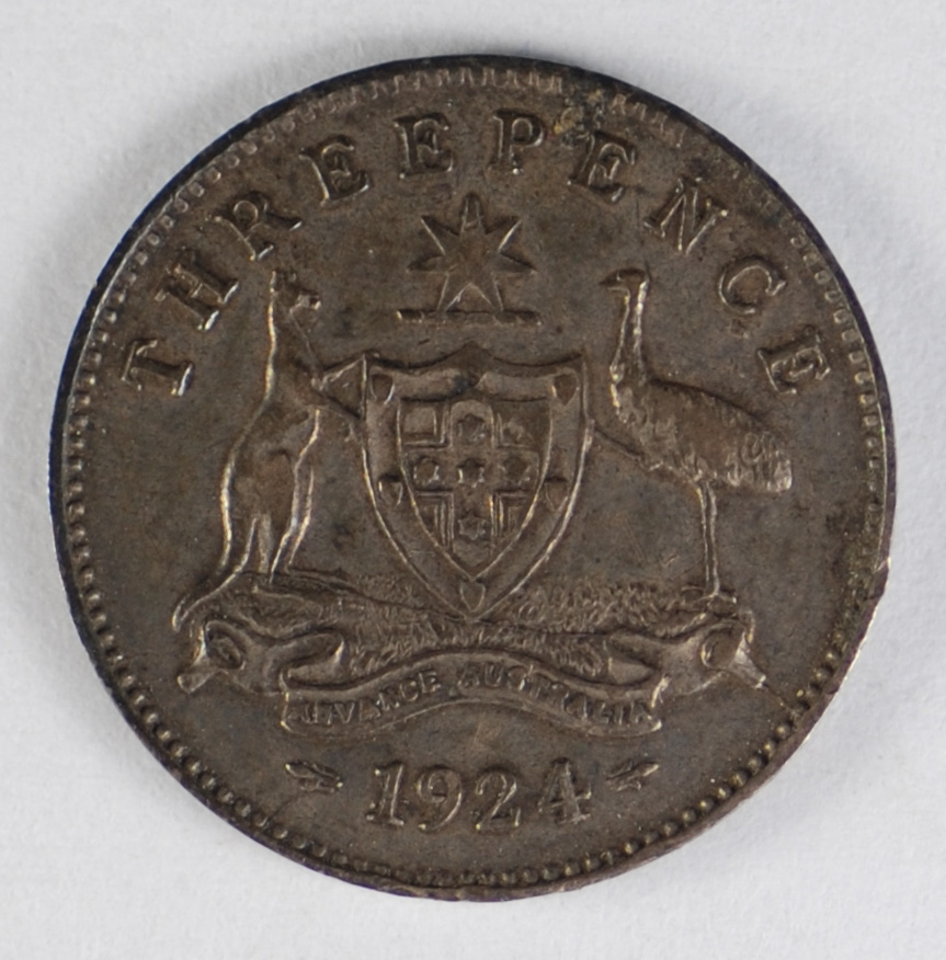 FC | 38842 | 1923 (m) | AUSTRALIA | 3 Pence | Arms | George V | 0.925 | 0.0393 | Silver | 24 | 3 | Extremely Fine | $125.00 |