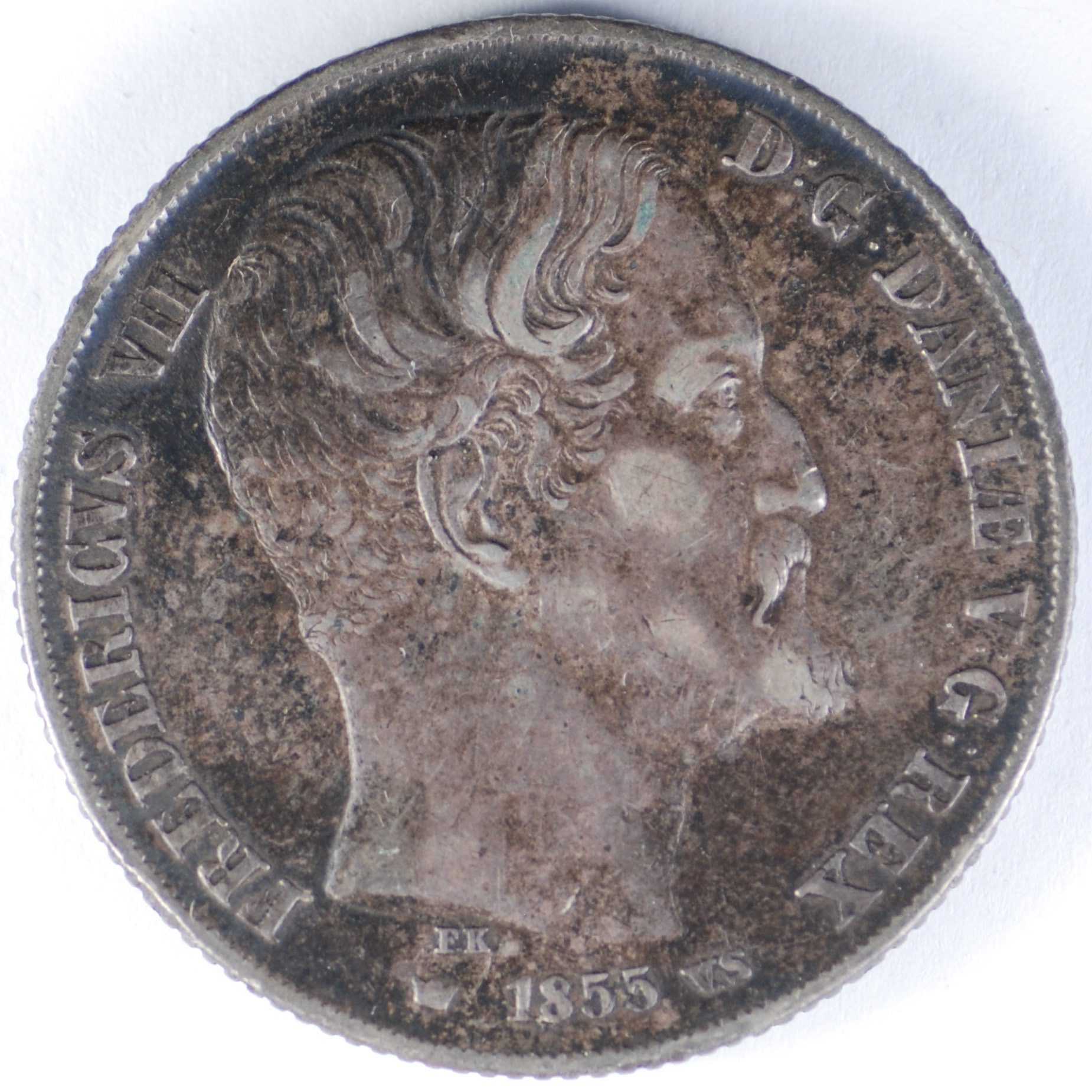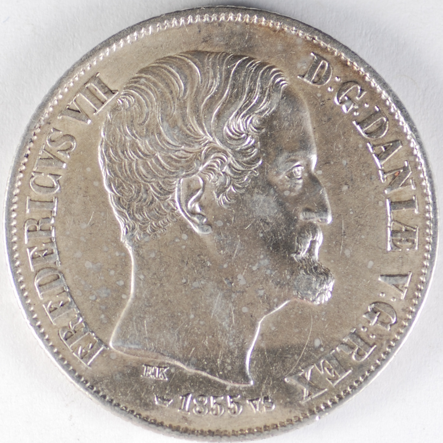 FC | 17598 S | 1855-FK/VS | DENMARK | 2 Rigsdaler | Frederik VII | 0.875 | 0.8128 | Silver | 761.2 | Very Fine | $260.00 | |