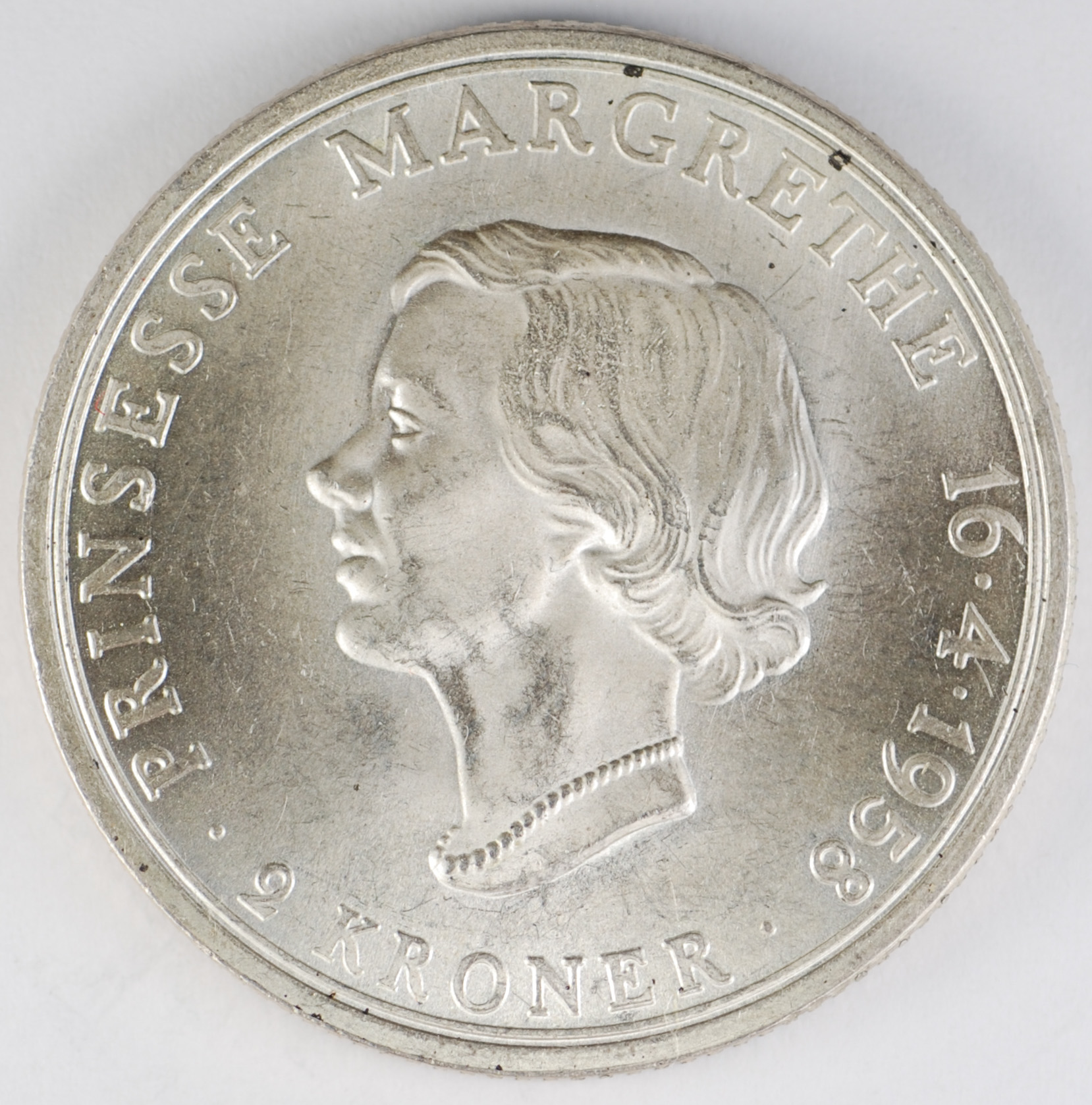 FC | 17140 | 1958 | DENMARK | 2 Kroner | Frederik IX | Princess Margrethe's 18th Birthday | 0.800 | 0.3858 | Silver | 845 | Bril. Uncirculated | $50.00 |