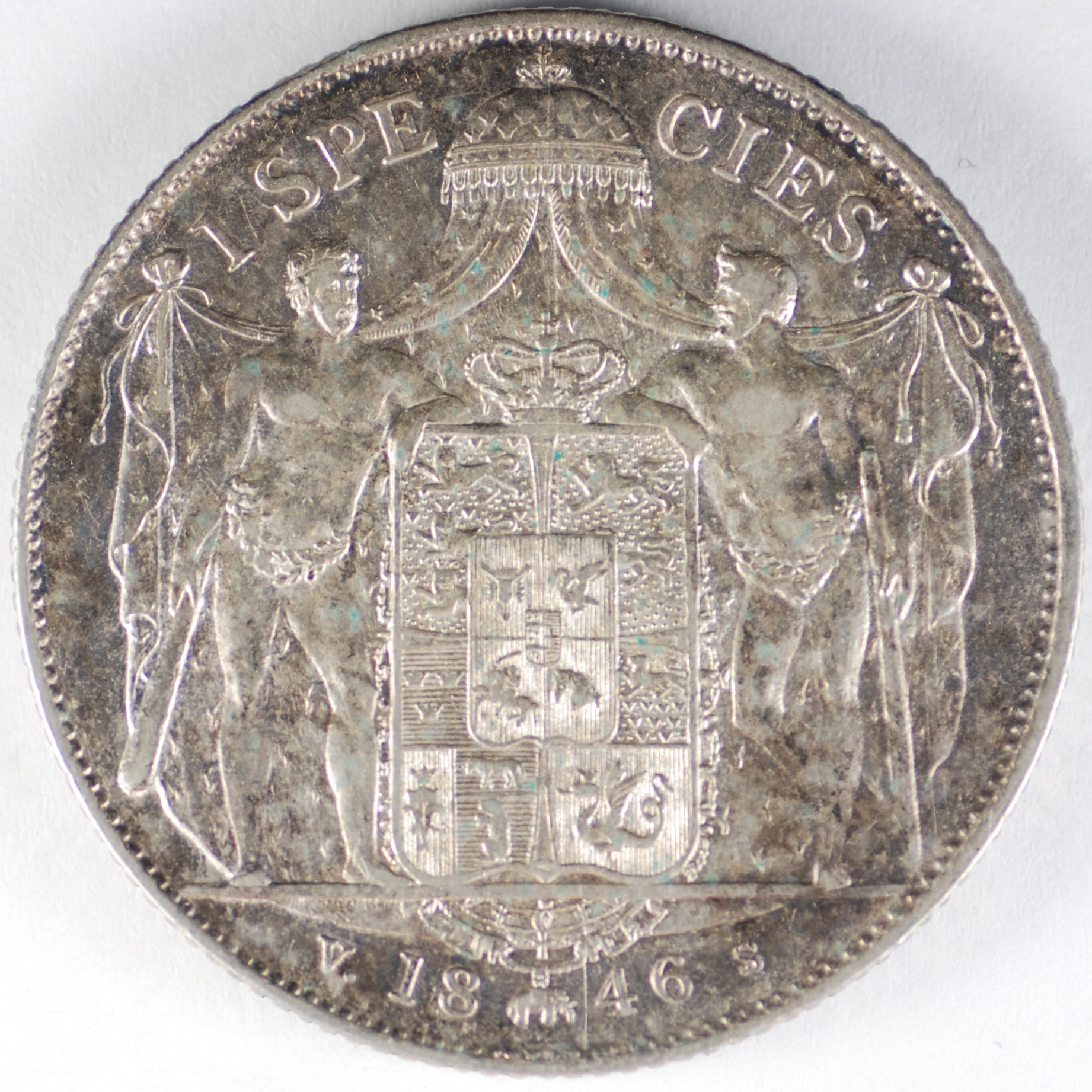 FC | 17594 S | 1846-VS | DENMARK | 1 Speciedaler | Christian VIII | Crowned Arms | 0.875 | 0.8128 | Silver | 741 | About Uncirculated | $875.00 |