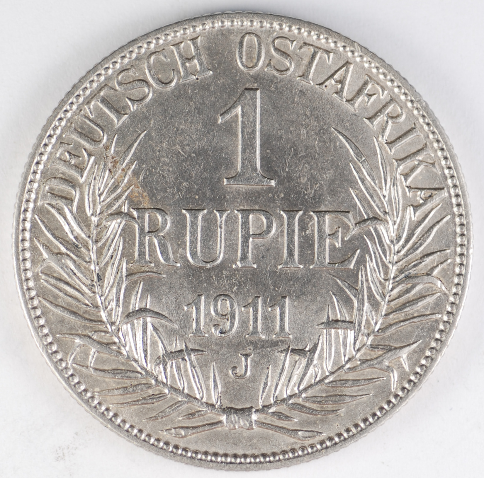 FC | 39684 | 1911-J | GERMAN EAST AFRICA | 1 Rupie | Wilhelm II | Denomination and Date within Wreath | 0.917 | 0.3439 | Silver | 10 | About Uncirculated | $120.00 |