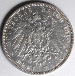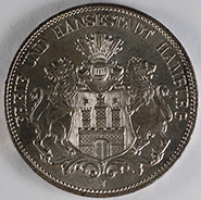 | FC | 36450 | 1910J | GERMANY-Hamburg | 3 Mark | Castle on Helmeted Shield | Crowned Imperial Eagle | 0.9 | 0.4823 | Silver | 620 | Extremely Fine | $36.00 | ||