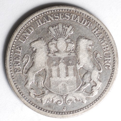 | FC | 28182 | 1904-J | GERMAN STATES - HAMBURG | 2 Mark | Helmeted Arms, Lions | Crowned Imperial Eagle | 0.900 | 0.3215 | Silver | 612 | Very Fine | $20.00 | ||