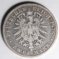 | FC | 36488 | 1876-J | GERMANY-HAMBURG | 2 Mark | Helmeted Arms with Lion Supporters | Dramatic Die Break at Date | 0.9 | 0.3215 | Silver | 604 | Very Fine | $135.00 | ||