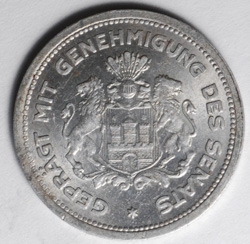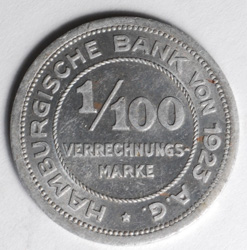 | FC | 38072 | 1923 | GERMANY-Hamburg | 1/100 Verrechnungs Mark | Coat of Arms | Hamburg Bank | Aluminum | Uncirculated | $25.00 | |||||