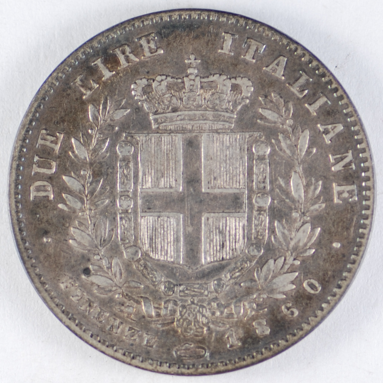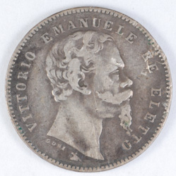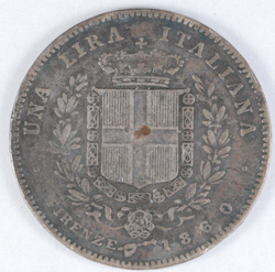 | FC | 35725 | 1860 | ITALY - Firenze | 1 Lira | Vittorio Emanuelle II | Crowned Shield of Savoy | 0.900 | 0.1447 | Silver | 9 | Very Fine | $120.00 | ||