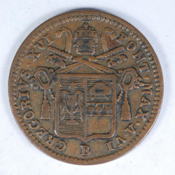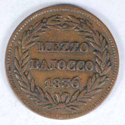 FC | 33465 | 1836-VI-B | ITALIAN STATES - PAPAL STATES | 1/2 Baiocco | Gregory XVI, Papal Arms | Copper | Very Fine | $10.00 | ||||