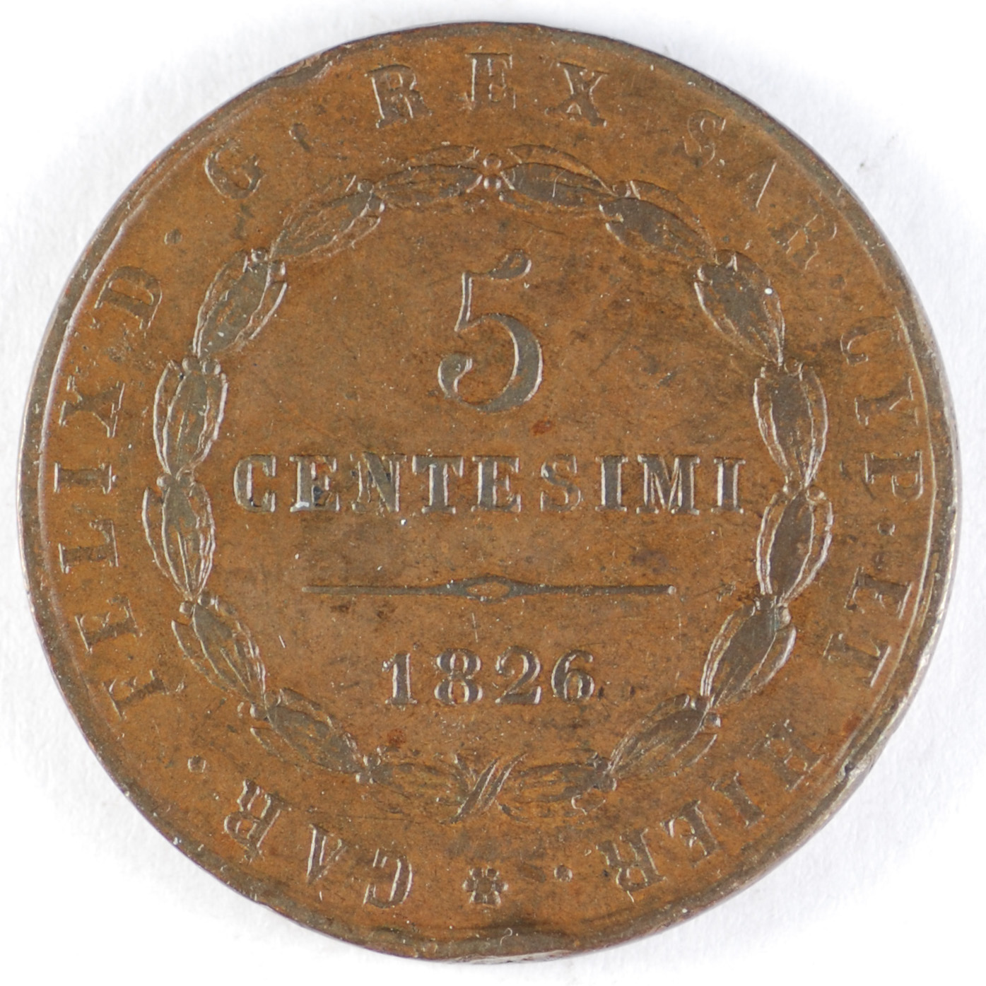 | FC | 22118 | 1826 | ITALY - Sardinia | 5 Centesimi | Carlo Felice | Copper | 127.2 | Fine | $12.00 | |||||