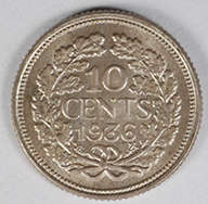 | FC | 50212 | 1936 | NETHERLANDS | 10 Cents | Wilhelmina I | 0.640 | 0.0288 | Silver | 163 | Extremely Fine | $2.00 | |||
