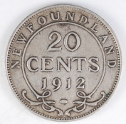 FC | 21964 | 1912 | NEWFOUNDLAND | 20 Cents | George V | 0.925 | 0.1401 | Silver | 15 | Very Fine | $14.00 | |