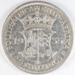 | FC | 35393 | 1935 | SOUTH AFRICA | 2-1/2 Shillings | Shield | George V | 0.800 | 0.3367 | Silver | 19.3 | Fine | $14.00 | ||