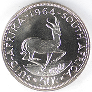 FC | 39250 | 1964 | SOUTH AFRICA | 50 Cents | Springbok | 0.500 | 0.4546 | Silver | 62 | Prooflike | $28.00 | |