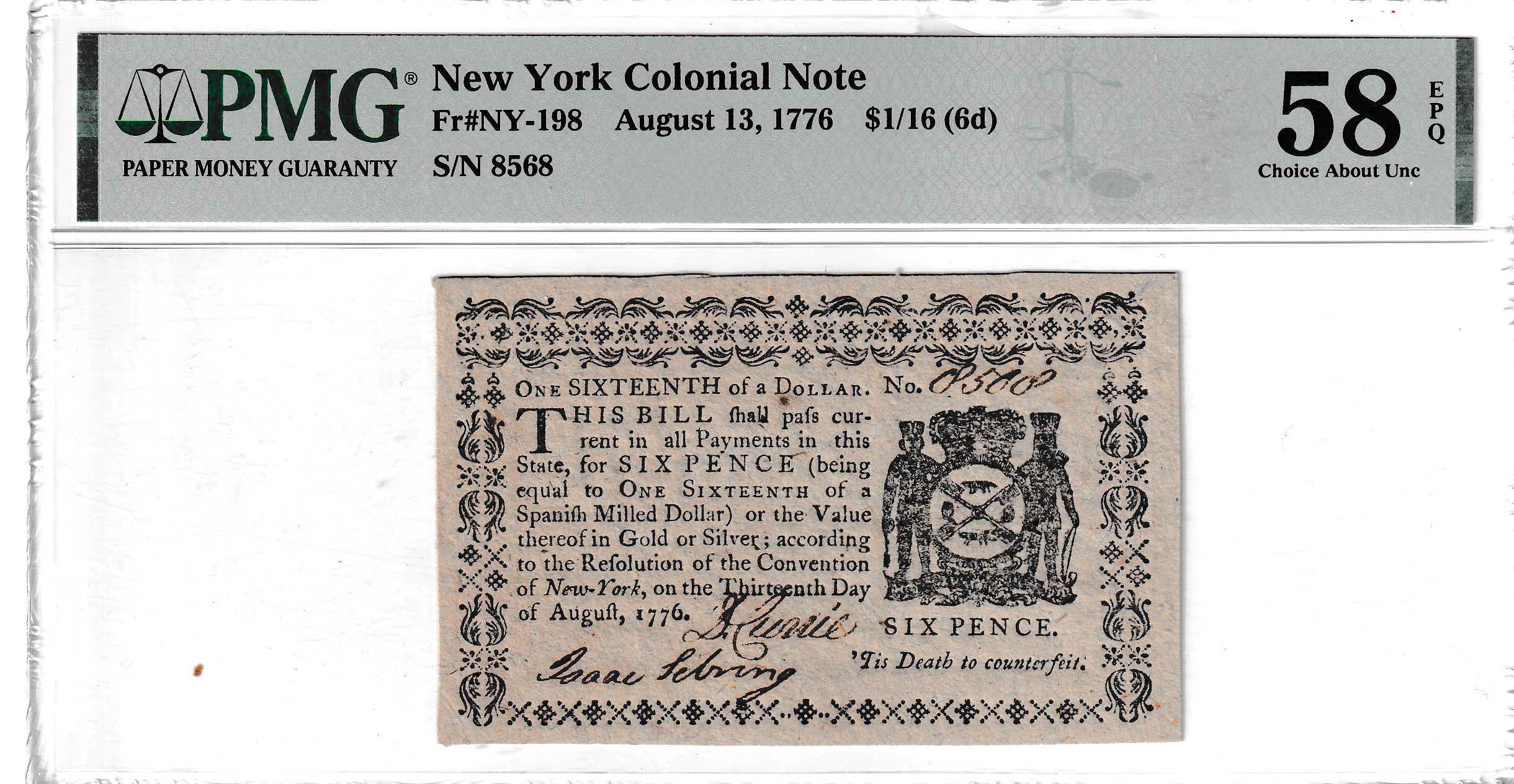 | 1776 | 8250 S | 6 Pence | Colonial Currency | New York, David Currie and Isaac Sebring | 8568 | Fr. #NY-198 | PMG AU-58 | $1,050.00 | ||||