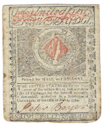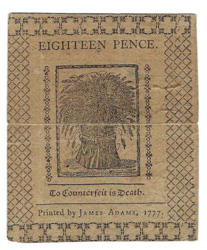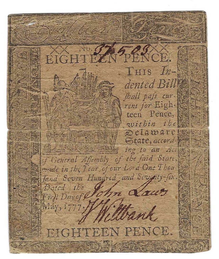 18 pence | Colonial Currency | Delaware, May 1, 1777 | 376503 | John Laws, John Wiltbank | Extremely Fine | $500.00 | ||||