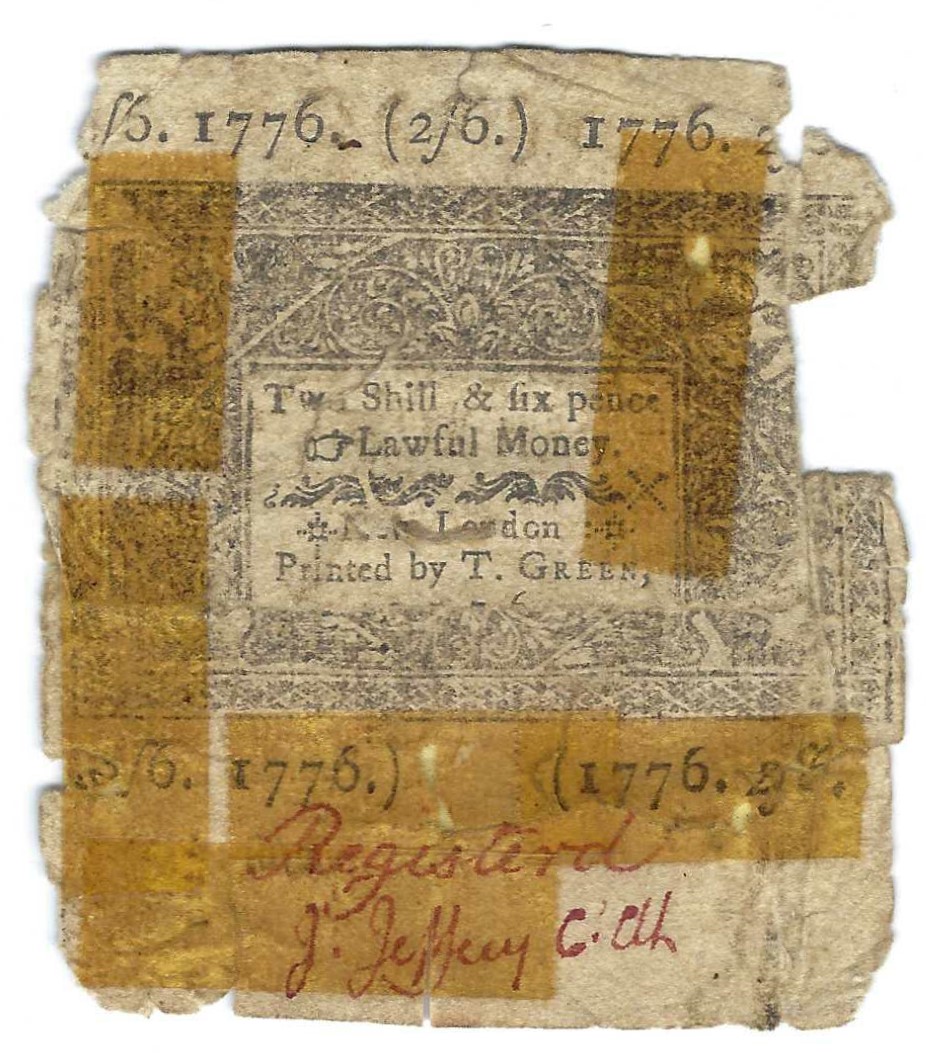 1776 | 2991 | 2 Shillings | Colonial Currency | Connecticut, June 7, 1776 | xxxx | 2 Notes | From the Rag Bag | $35.00 | ||