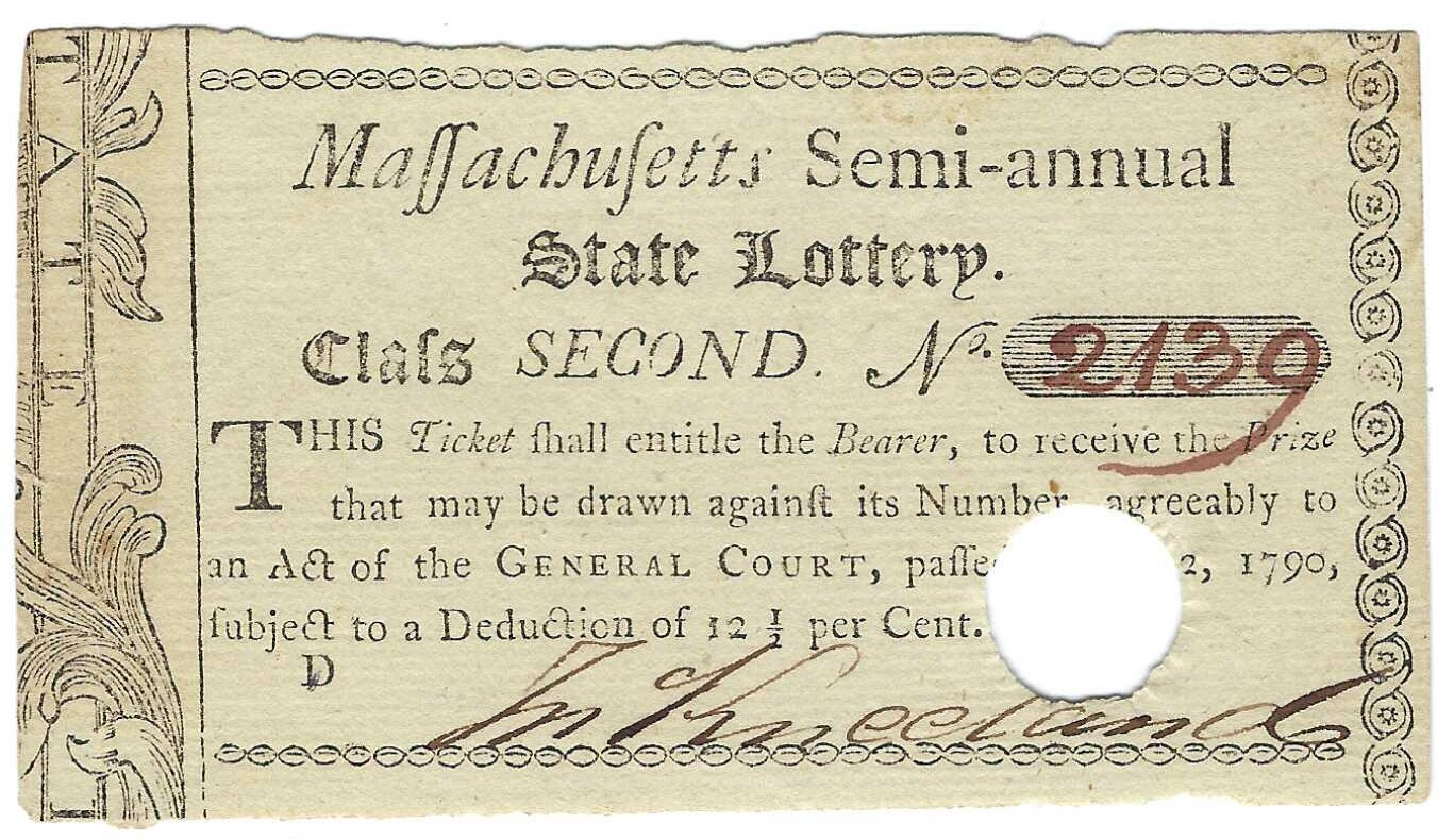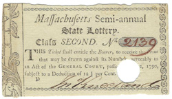 Colonial Currency | Massachusetts Lottery Ticket March 2, 1790 | 2139 | Punched Canceled | About Uncirculated | $295.00 | |||||
