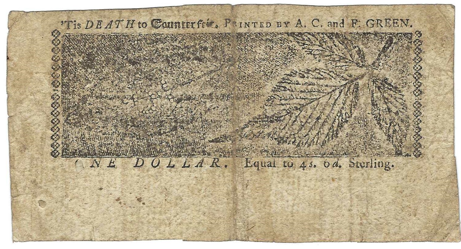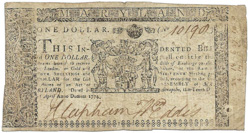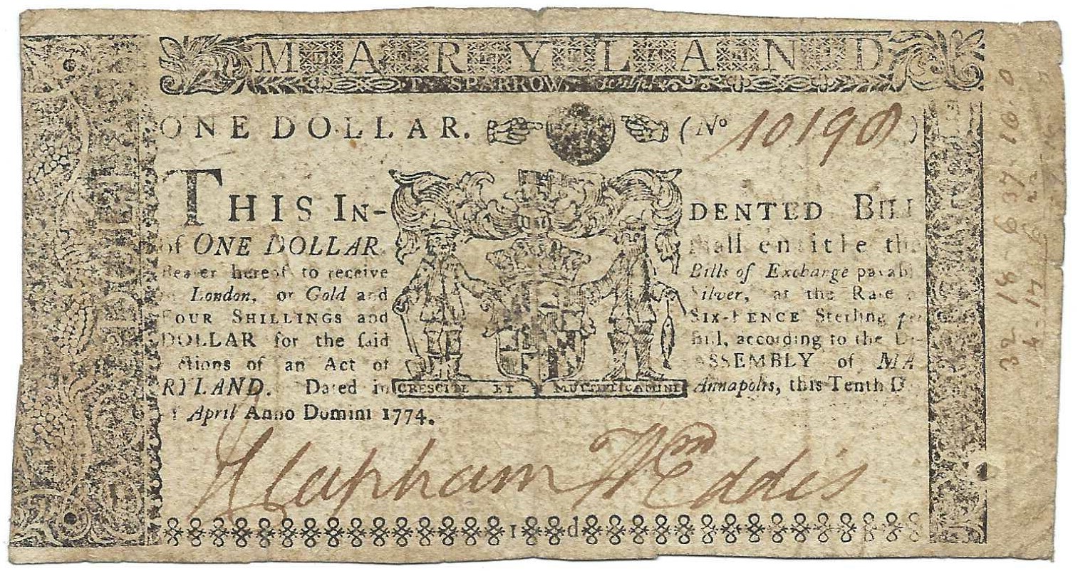 $1.00 | Colonial Currency | Maryland, April 10. 1774 | 10190 | John Clapham, William Eddis | About Uncirculated | $400.00 | |||
