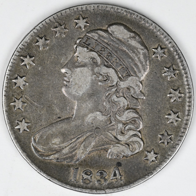 | 79664 R | 1834 | Capped Bust Half Dollar | Small Date, Stars, & Letters | Fine | $94.00 | ||