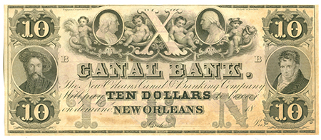 | 6837 | 1850's | 10 Dollars | Obsolete Bank Note | New Orleans Canal and Banking Company | Remainder | 5 | $120.00 | |||||||