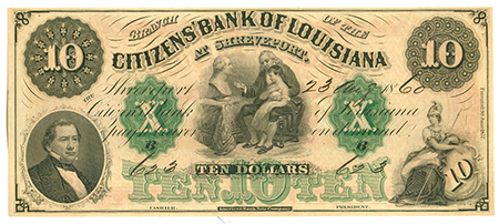 | 3250 | 1860 | 10 Dollars | Obsolete Bank Note | Citizens Bank of Louisiana, Shreveport | Series C 623 | Remainder | 5 | Uncirculated | $100.00 | |||||
