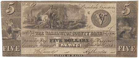 | 1476 | 1836 | 5 Dollars | Obsolete Bank Note | Maine, Washington County Bank, Calais | 1601 | 250-G16 | 2 | Extremely Fine | $75.00 | |||||