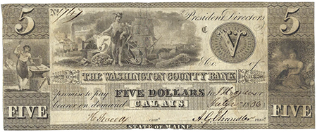 | 3669 | 1836 | 5 Dollars | Obsolete Bank Note | Washington County Bank | 704 | W-ME-610-005-G040, URS-10 | 2 | Pinholes | $70.00 | |||||