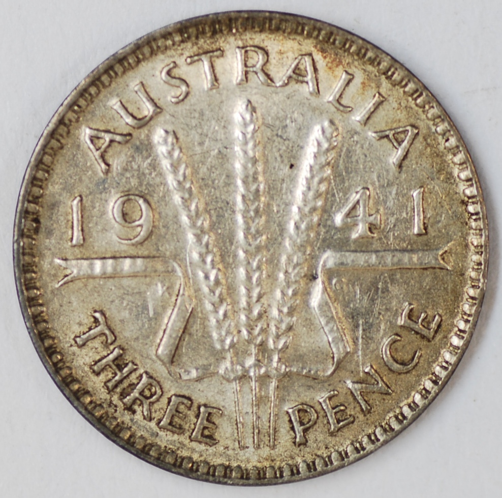 | FC | 387 | 1941 (m) | AUSTRALIA | 3 Pence | Wheat Stalks | George VI | 0.925 | 0.0419 | Silver | 37 | 3 | Extremely Fine | $15.00 | ||