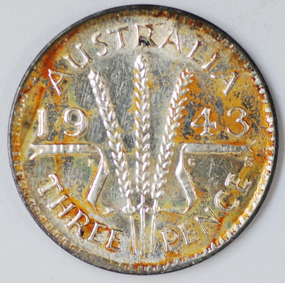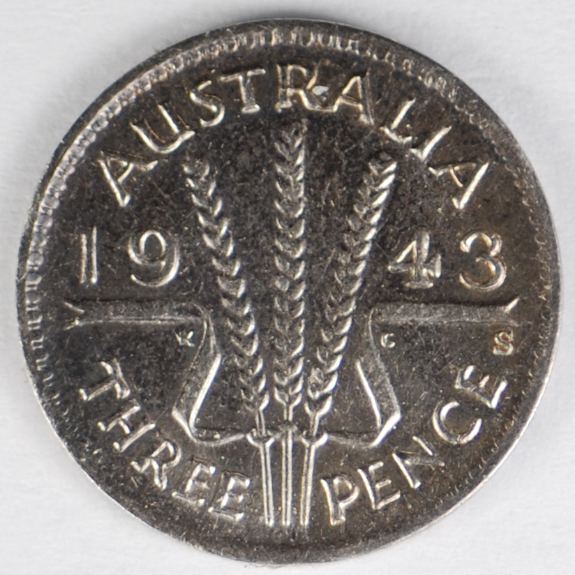 | FC | 403 | 1943 (m) | AUSTRALIA | 3 Pence | Wheat Stalks | George VI | 0.925 | 0.0419 | Silver | 37 | 3 | Extremely Fine | $2.25 | ||