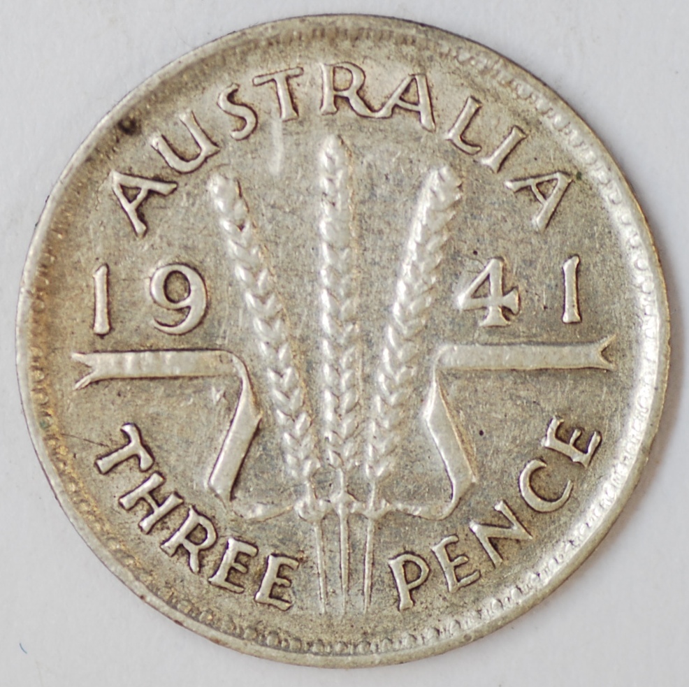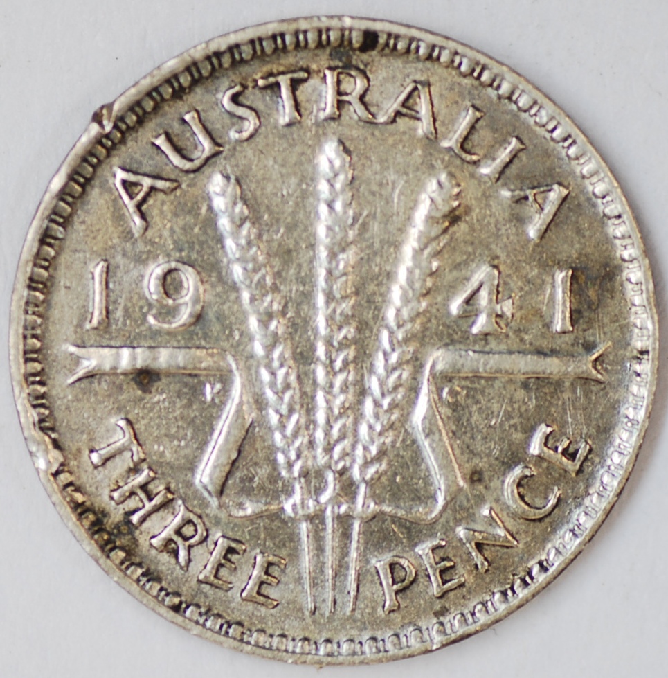 | FC | 389 | 1941 (m) | AUSTRALIA | 3 Pence | Wheat Stalks | George VI | 0.925 | 0.0419 | Silver | 37 | 3 | Extremely Fine | $15.00 | ||