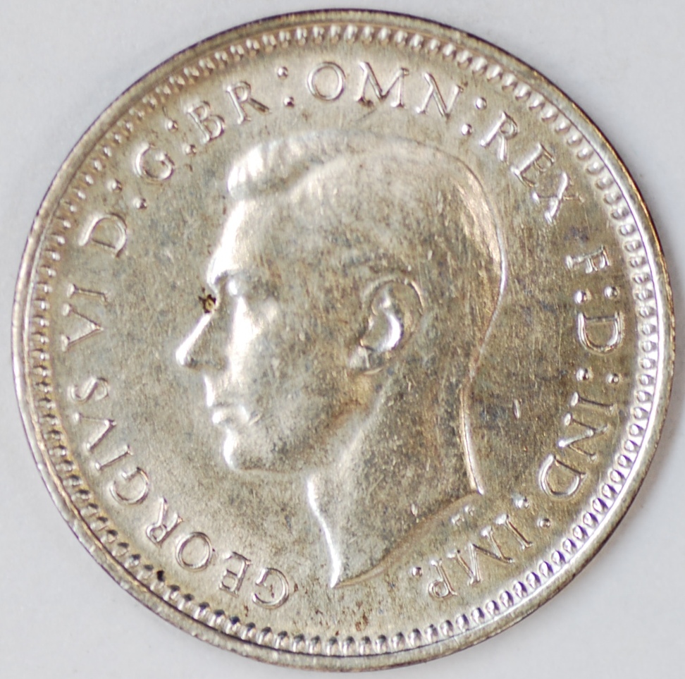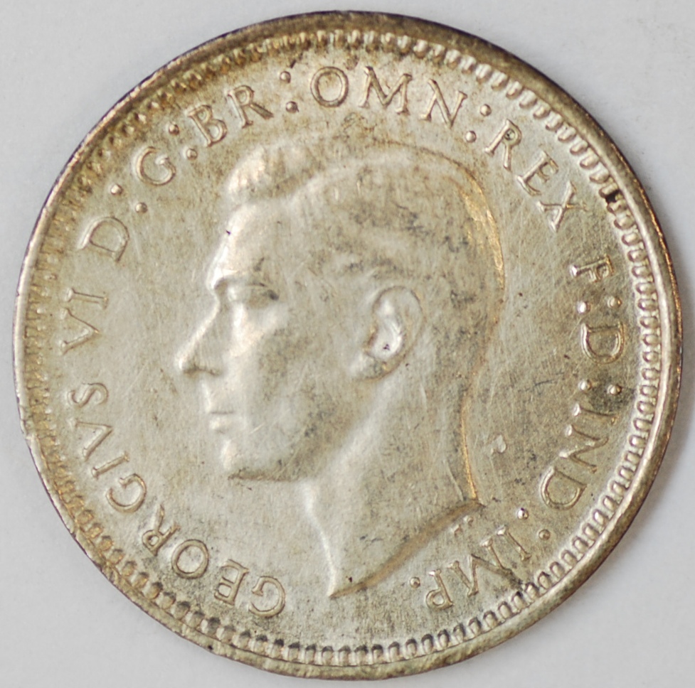 | FC | 6934 | 1943 (m) | AUSTRALIA | 3 Pence | Wheat Stalks | George VI | 0.925 | 0.0419 | Silver | 37 | 3 | About Uncirculated | $6.00 | ||