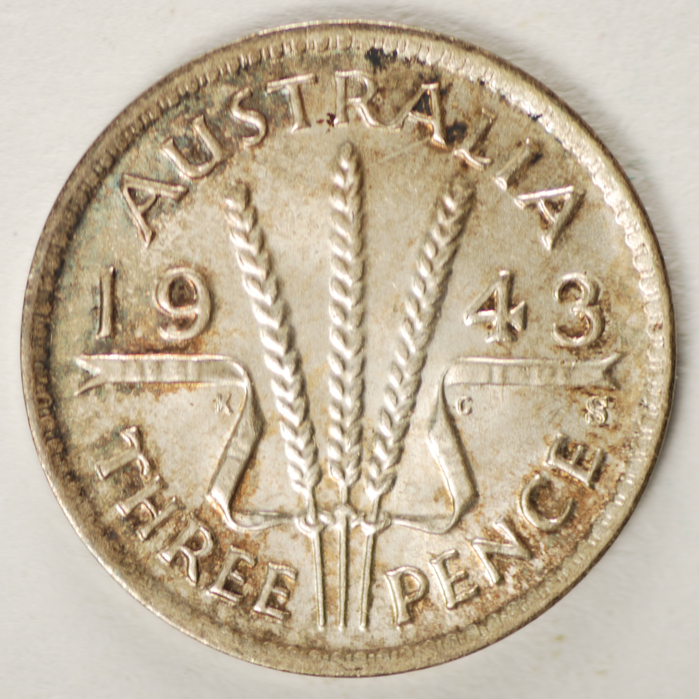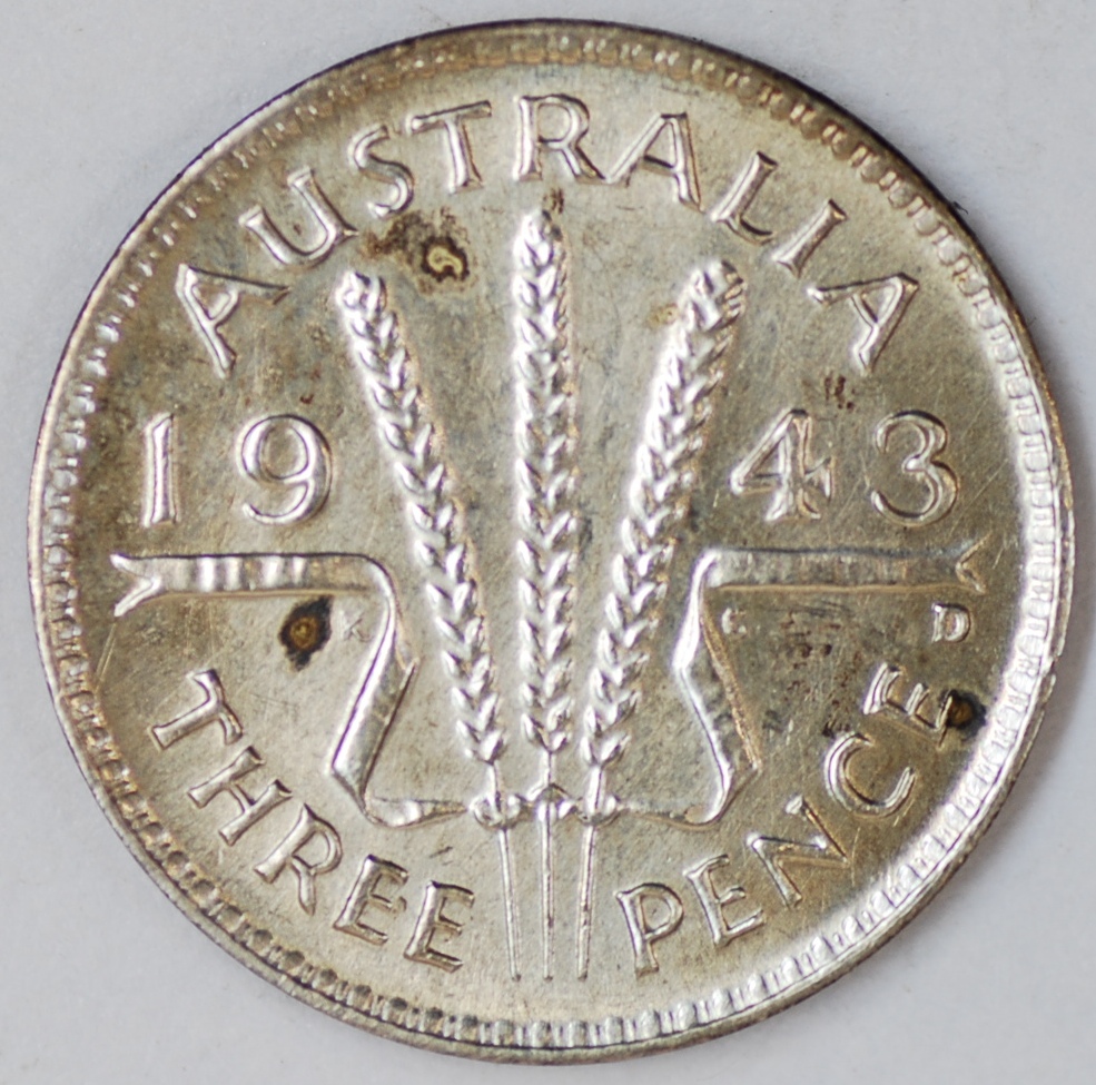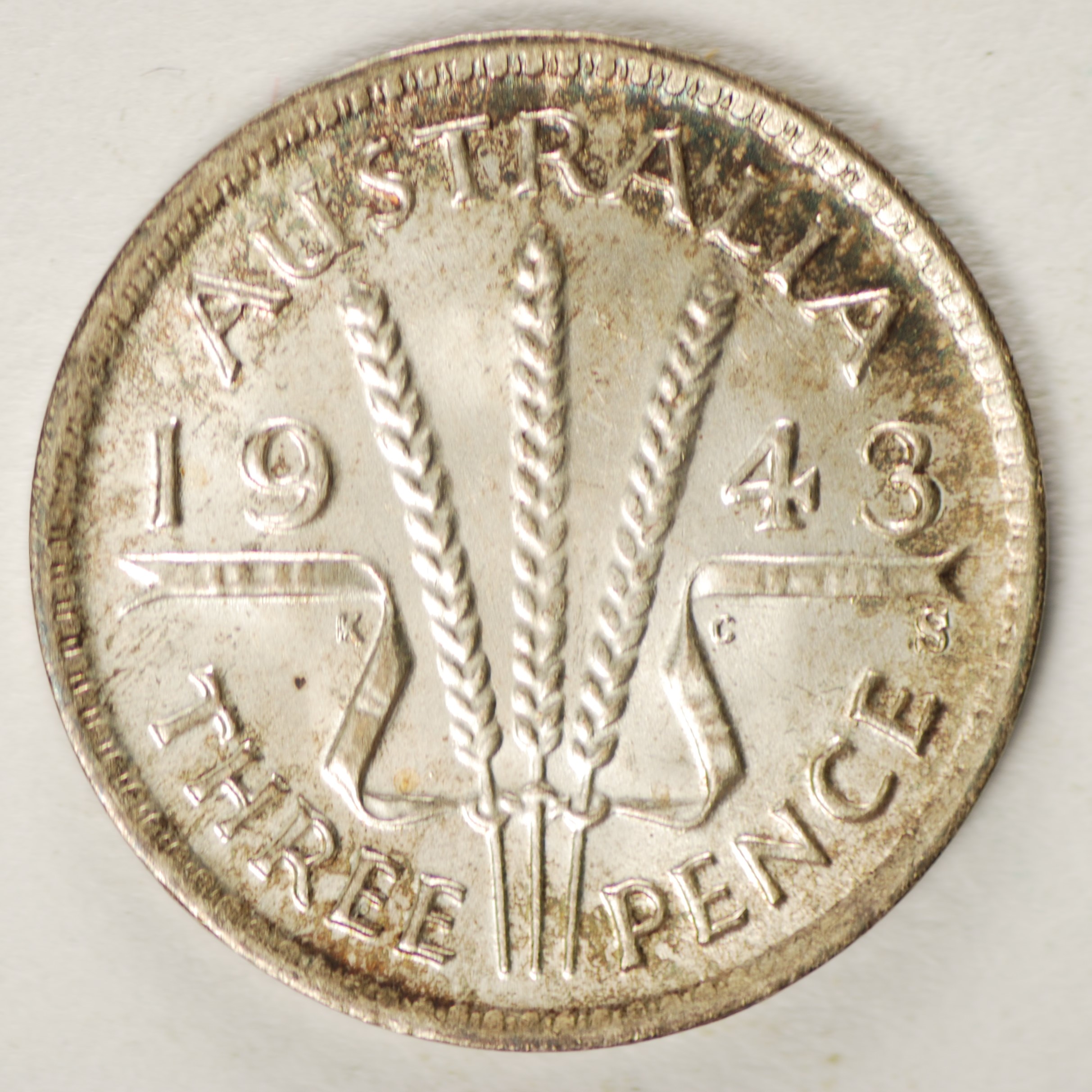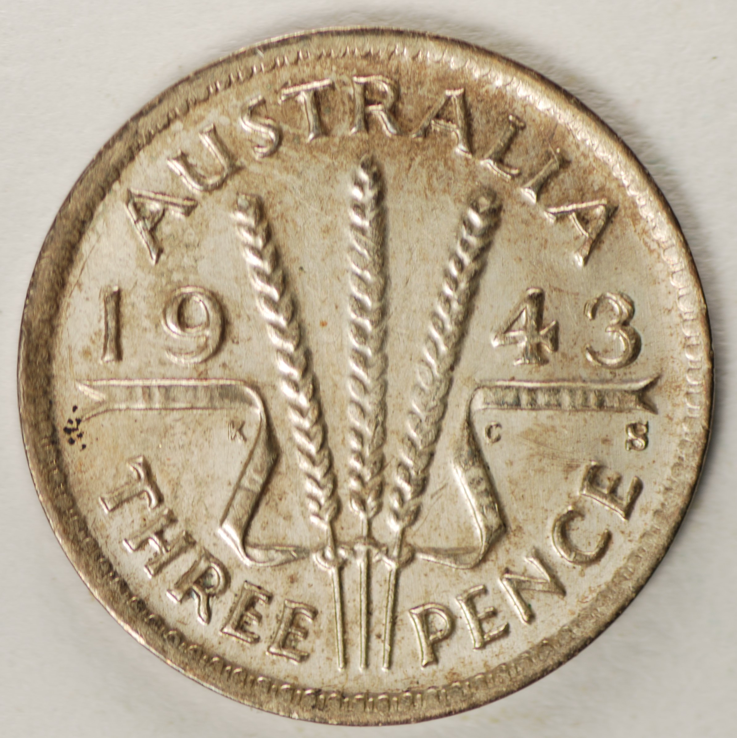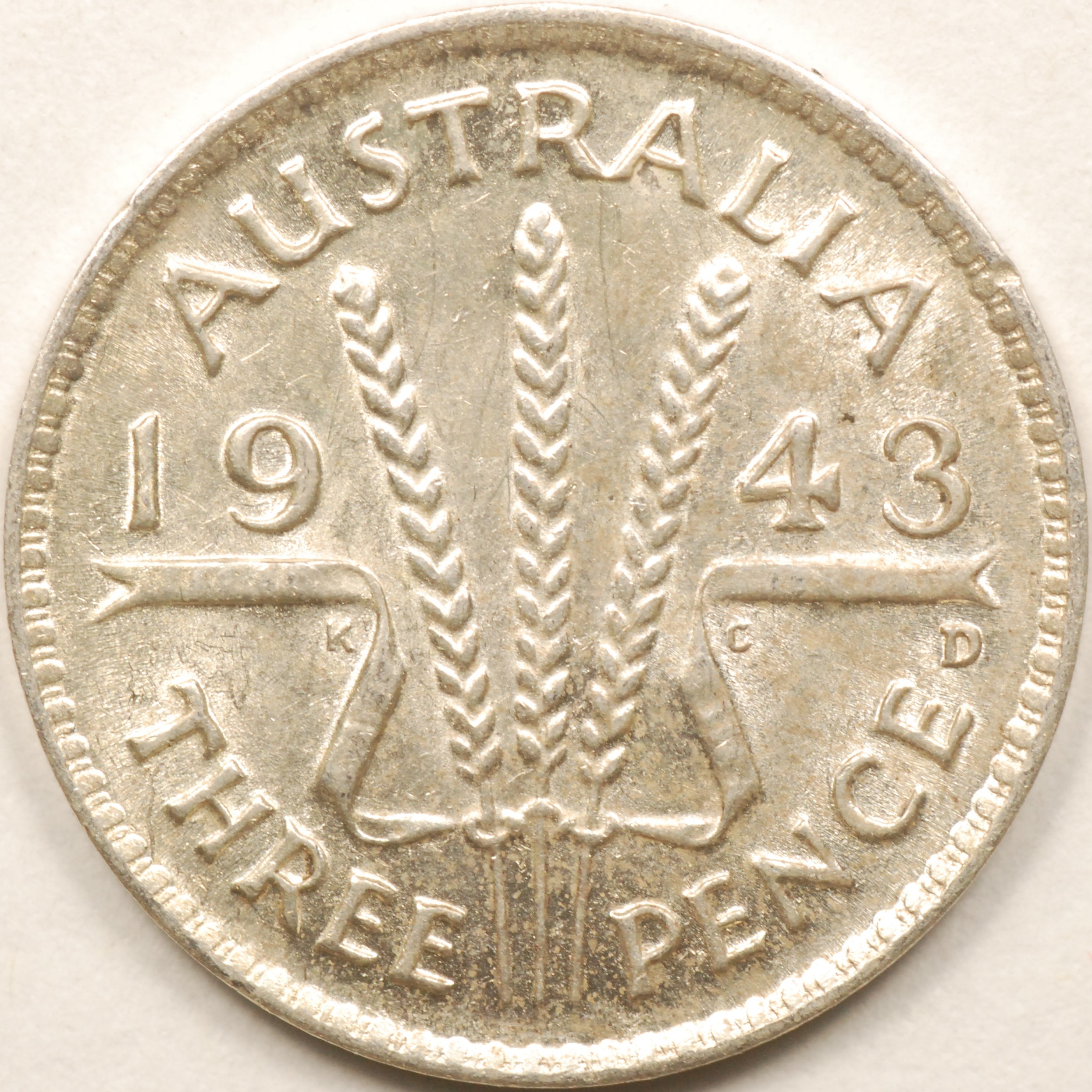 | FC | 401 | 1943 (m) | AUSTRALIA | 3 Pence | Wheat Stalks | George VI | 0.925 | 0.0419 | Silver | 37 | 3 | Uncirculated | $13.00 | ||