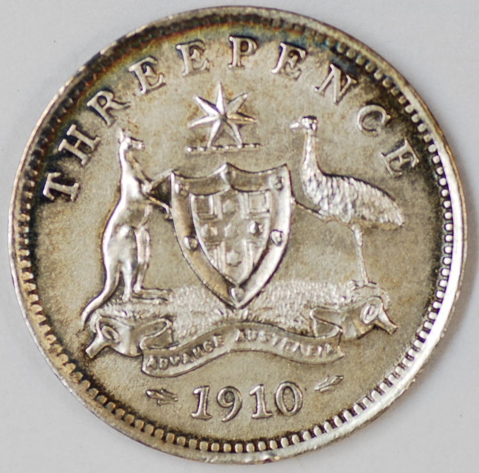 | FC | 6863 | 1910 (L) | AUSTRALIA | 3 Pence | Arms | Edward VII | 0.925 | 0.0419 | Silver | 18 | 3 | Fine | $2.25 | ||