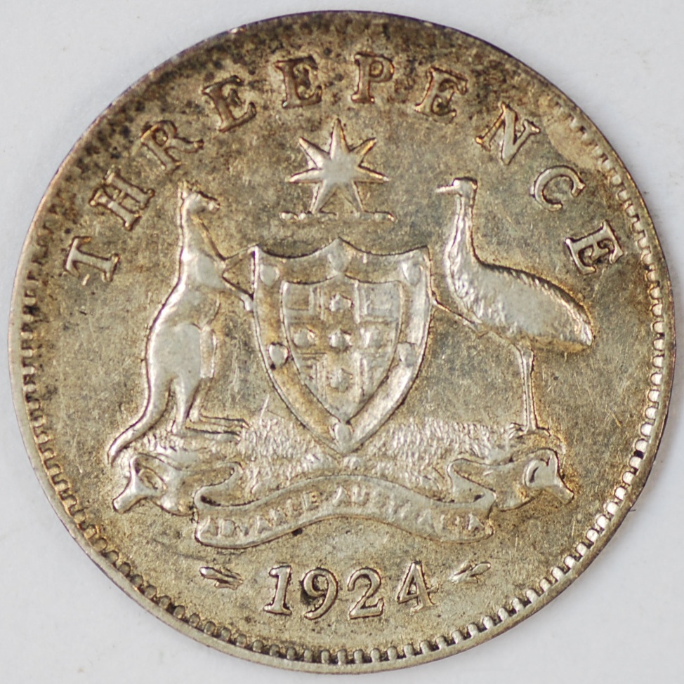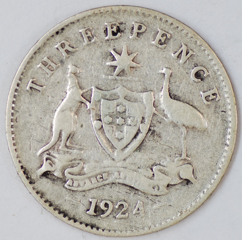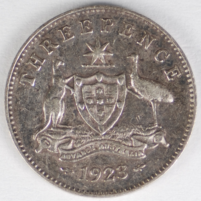 FC | 38842 | 1923 (m) | AUSTRALIA | 3 Pence | Arms | George V | 0.925 | 0.0393 | Silver | 24 | 3 | Extremely Fine | $125.00 |