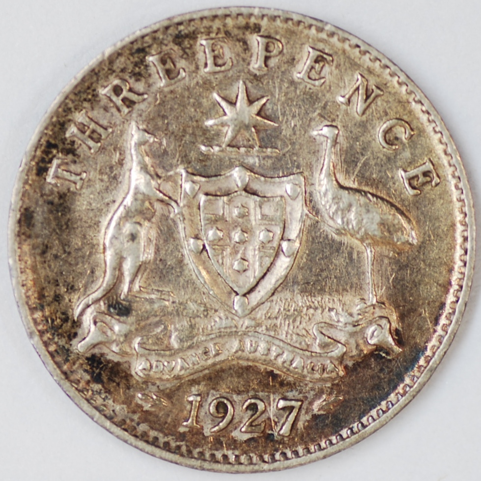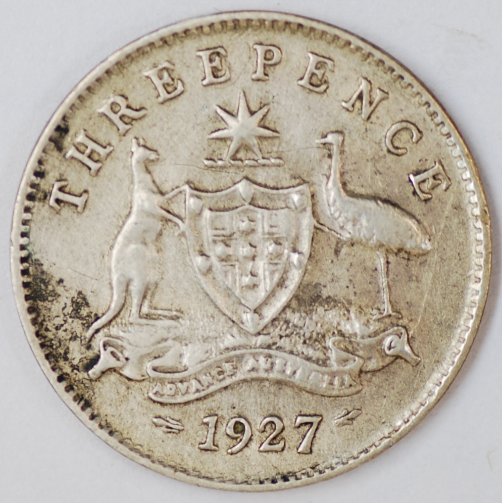 | FC | 365 | 1927 (m) | AUSTRALIA | 3 Pence | Arms | George V | 0.925 | 0.0393 | Silver | 24 | 3 | Very Fine | $4.00 | ||
