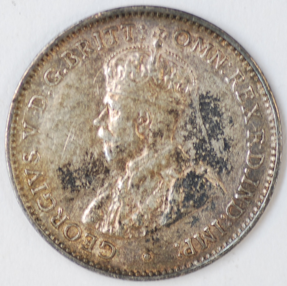| FC | 6874 | 1921 (m) | AUSTRALIA | 3 Pence | Arms | George V | 0.925 | 0.0393 | Silver | 24 | 3 | Fine | $5.00 | ||