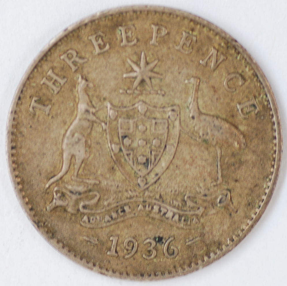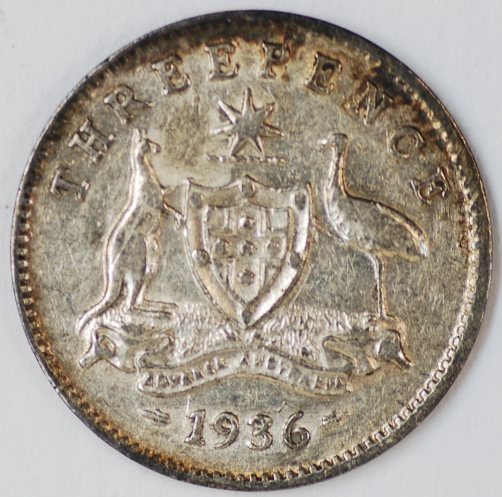 | FC | 38160 | 1936 | AUSTRALIA | 3 Pence | Arms, Kangaroo | George V | 0.925 | 0.0393 | Silver | 24 | 3 | Extremely Fine | $8.50 | ||