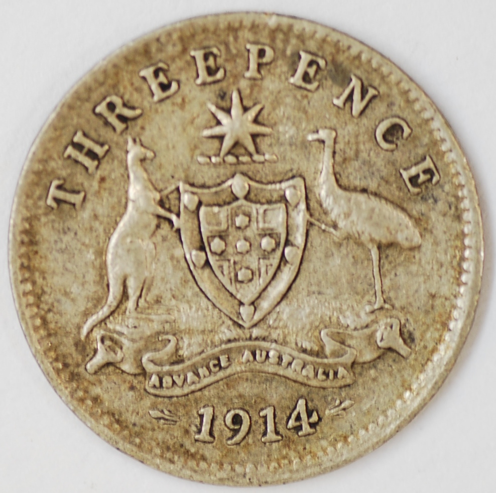| FC | 342 | 1912 (L) | AUSTRALIA | 3 Pence | Arms | George V | 0.925 | 0.0393 | Silver | 24 | 3 | Very Good | $8.00 | ||