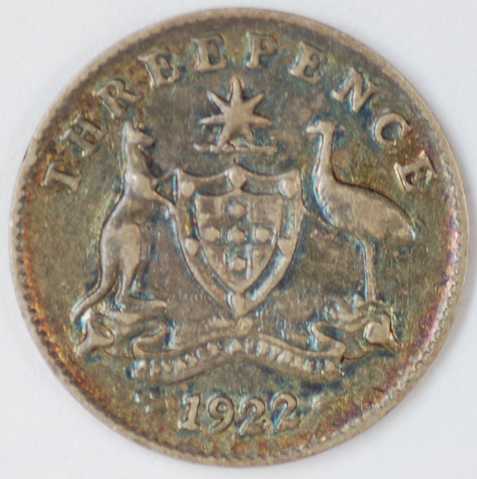 | FC | 6875 | 1922 (m) | AUSTRALIA | 3 Pence | Arms | George V | 0.925 | 0.0393 | Silver | 24 | 3 | Extremely Fine | $50.00 | ||