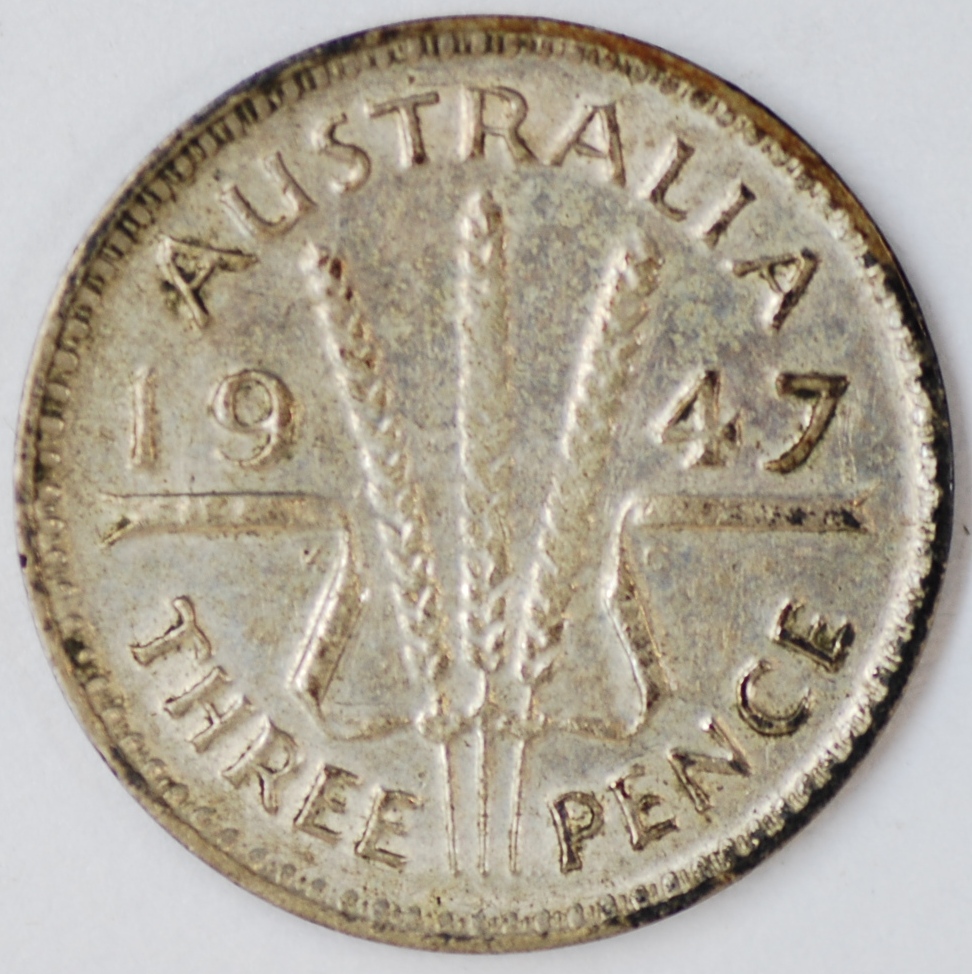 | FC | 6896 | 1947 (m) | AUSTRALIA | 3 Pence | Wheat Stalks | George VI | 0.500 | 0.0227 | Silver | 37a | 3 | Extremely Fine | $10.00 | ||